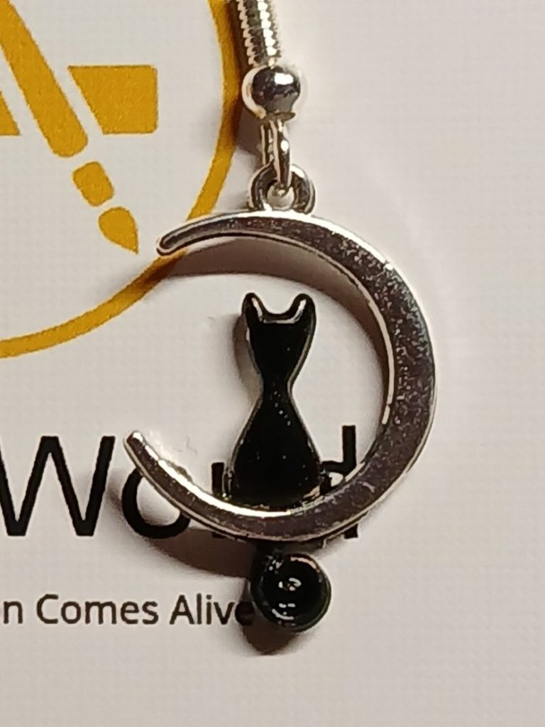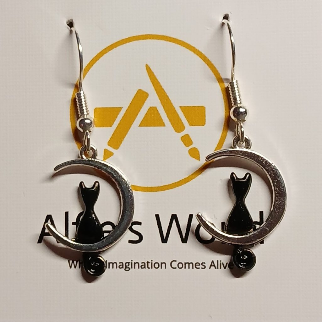 These lovely Black Cat sitting on the moon earrings have silver plated findings