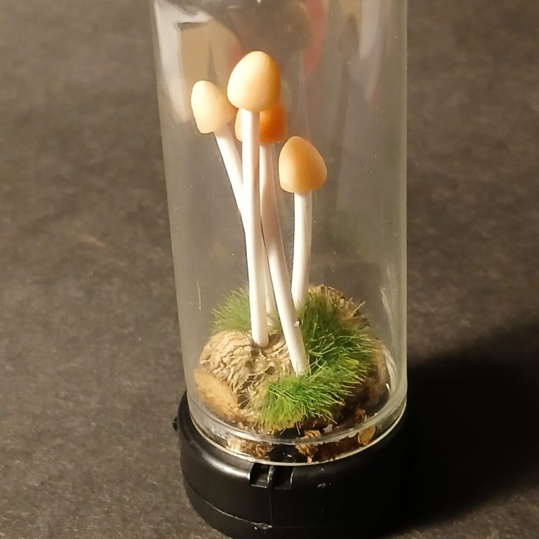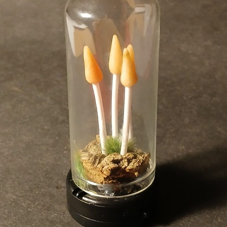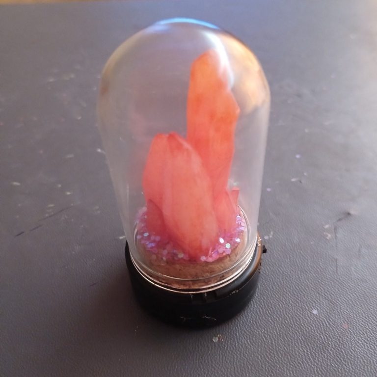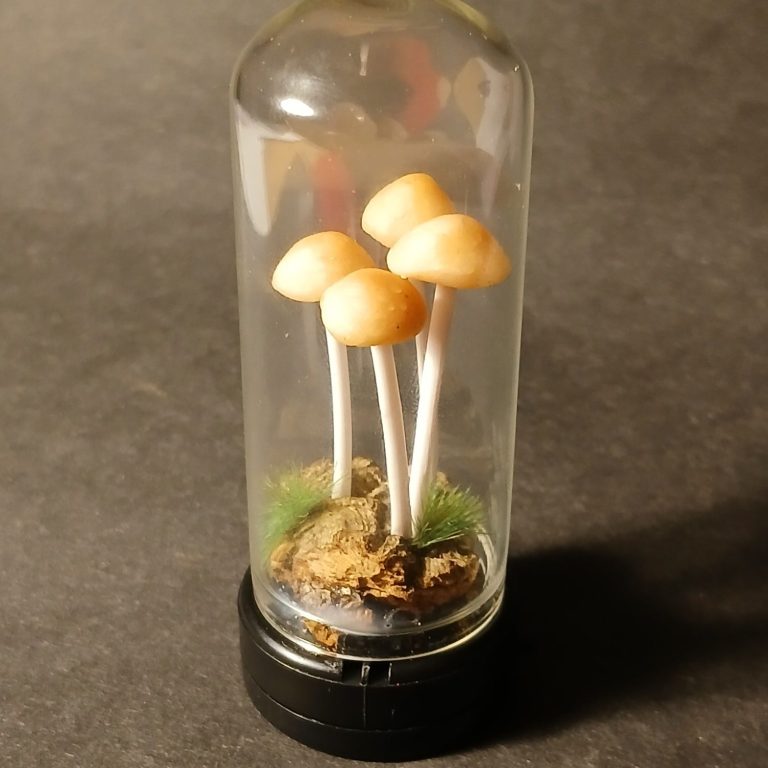 Each CrystalToadstool Terrarium contains 4 clay Toadstools , Resin crystal shards on a glittering surface in a small glass cloche.