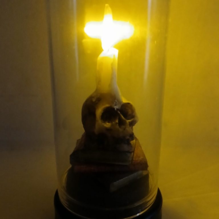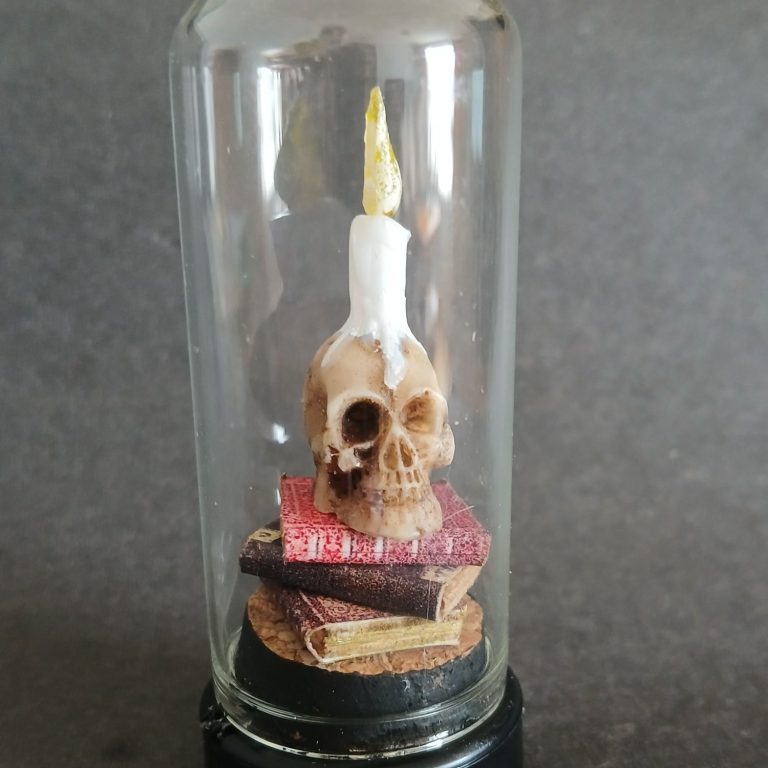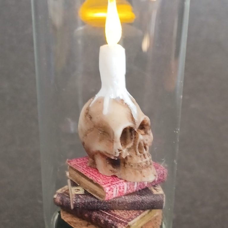 Each Light Up Skull Terrarium is made with a highly detailed resin skull with a light up candle on a pile of handmade books.