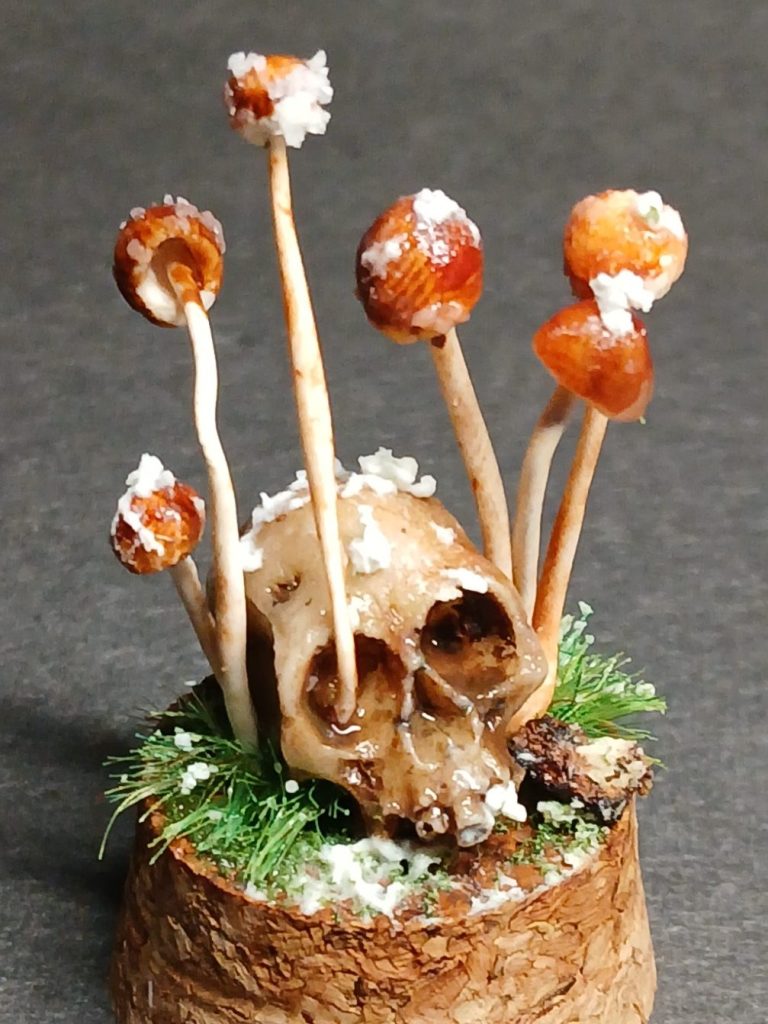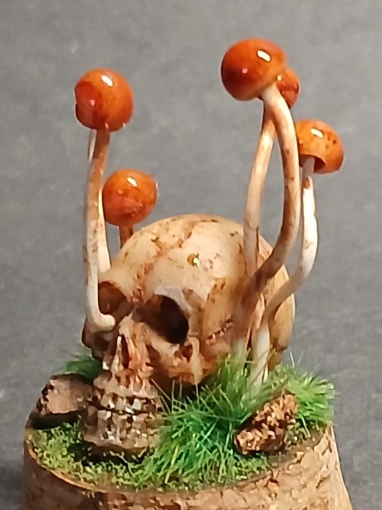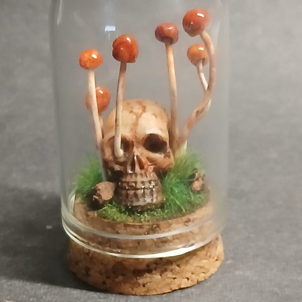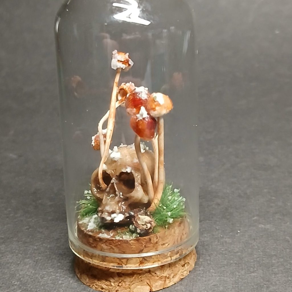 Each Skull & Toadstool Terrarium contains 6 clay Toadstools and resin skull in a small glass cloche.