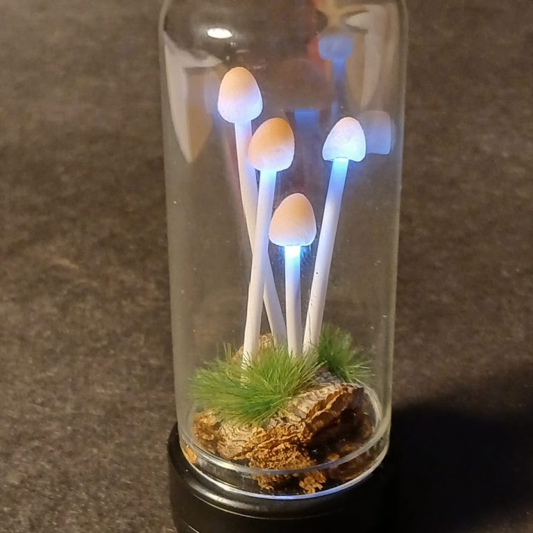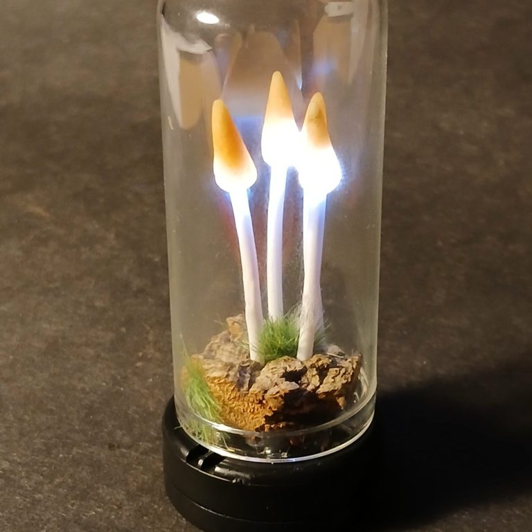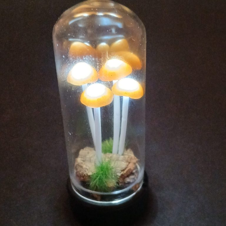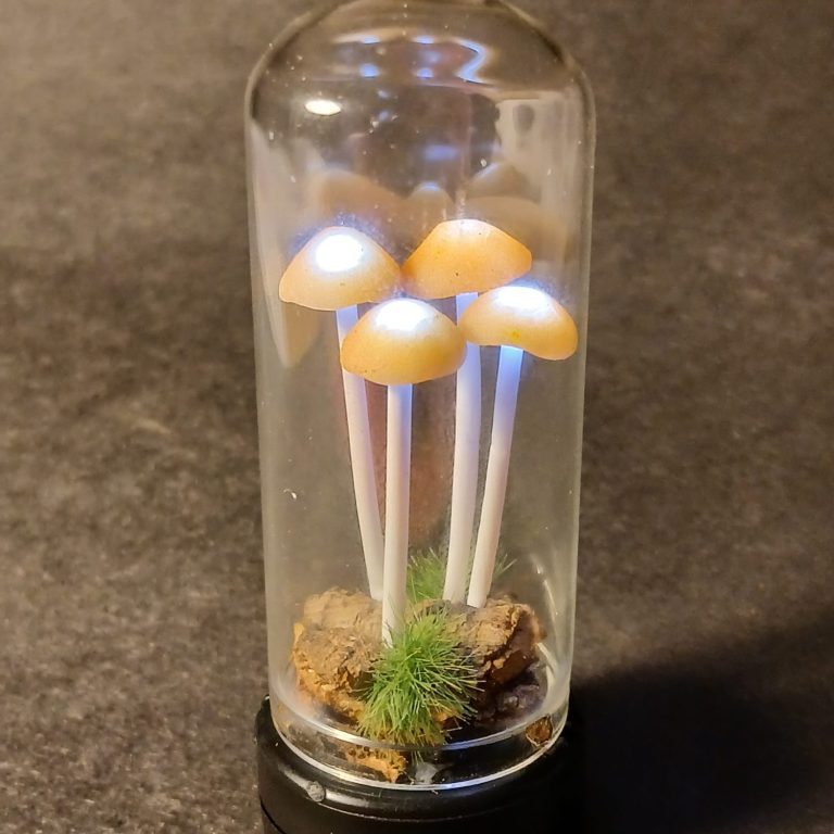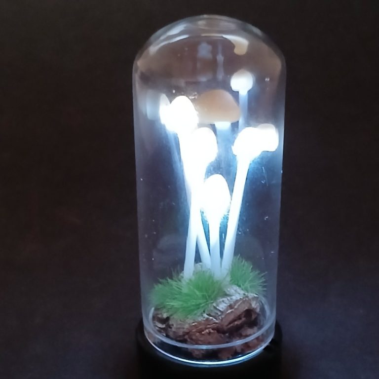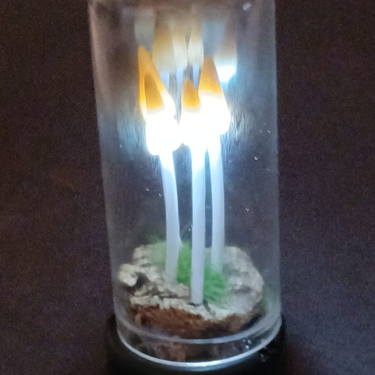 Each Light Up Toadstool Terrarium contains 4 clay Toadstools, in a small glass cloche. Powered by a single 3v CR20 Camera Battery (Supplied)