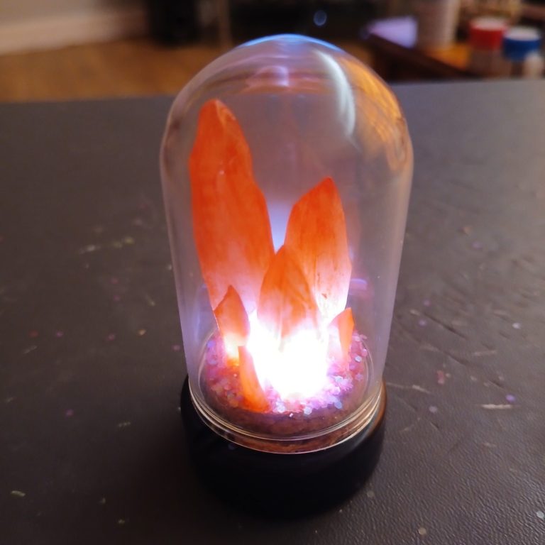 Each Light Up Red Terrarium contains 3 light up "crystals", in a small glass cloche. Powered by a single 3v CR20 Camera Battery (Supplied)