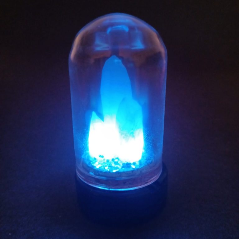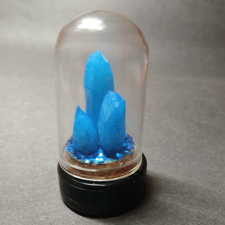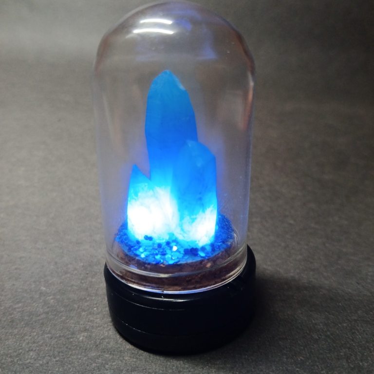 Each Light Up Blue Terrarium contains 3 light up "crystals", in a small glass cloche. Powered by a single 3v CR20 Camera Battery (Supplied)