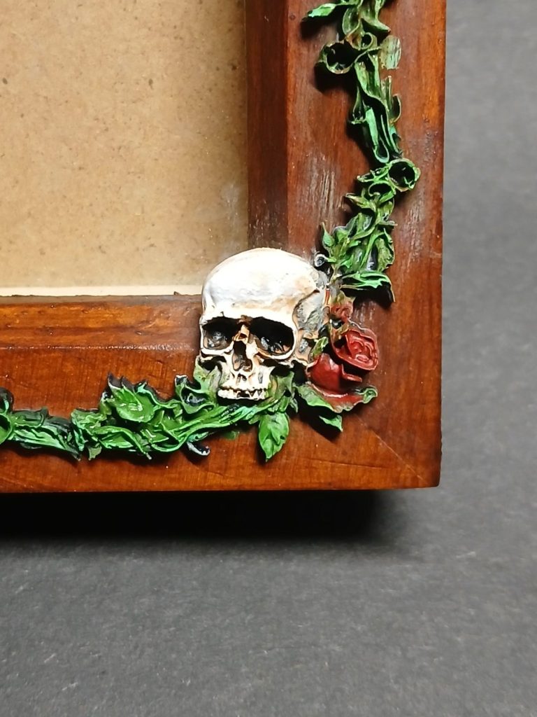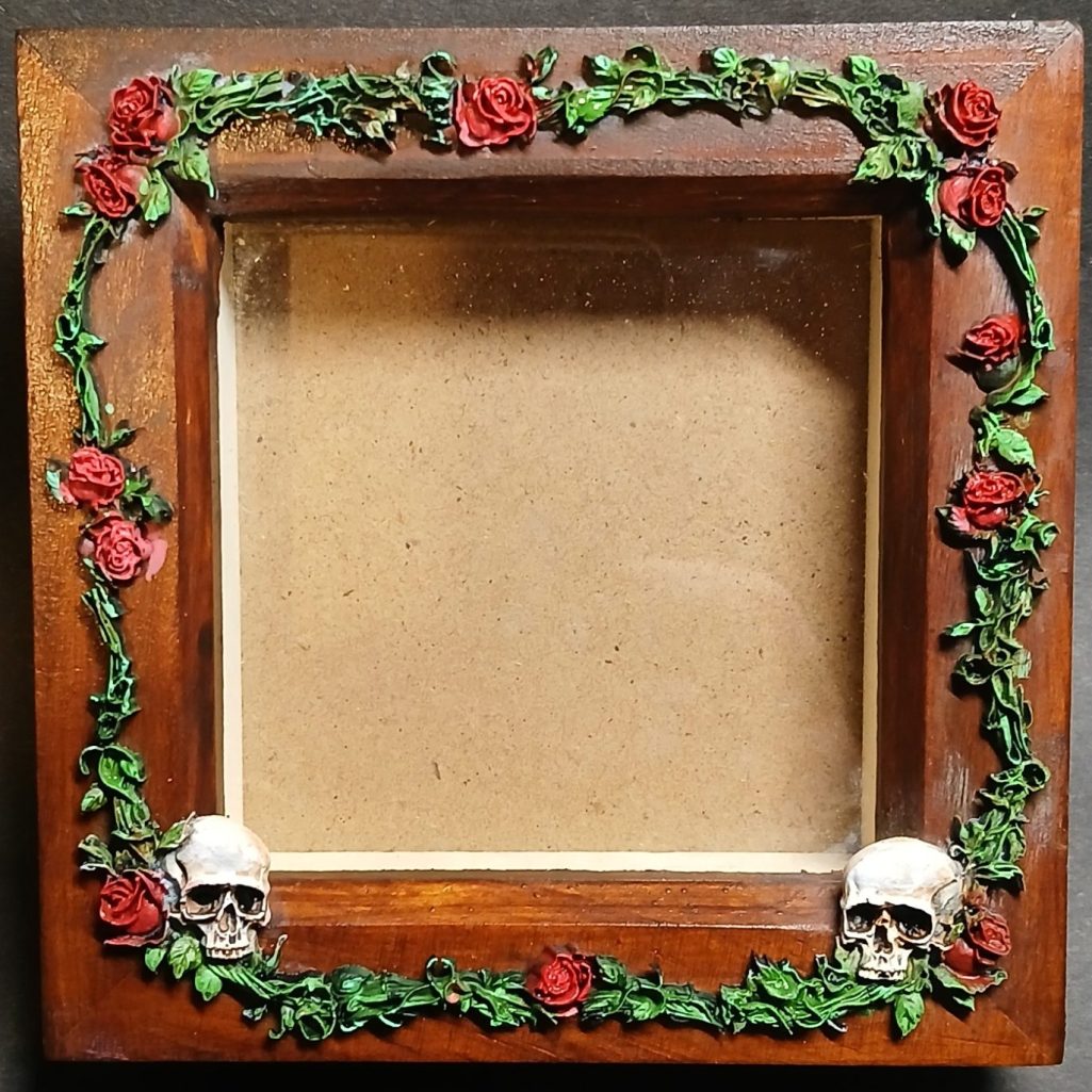 This beautifully gothic style, deep box, picture frame adds a touch of style to any room. Made from stained wood and embellished with tattoo style skulls and red roses.